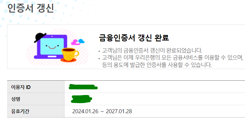 금융 인증서 탭에서 인증서 갱신을 눌러주세요!!!